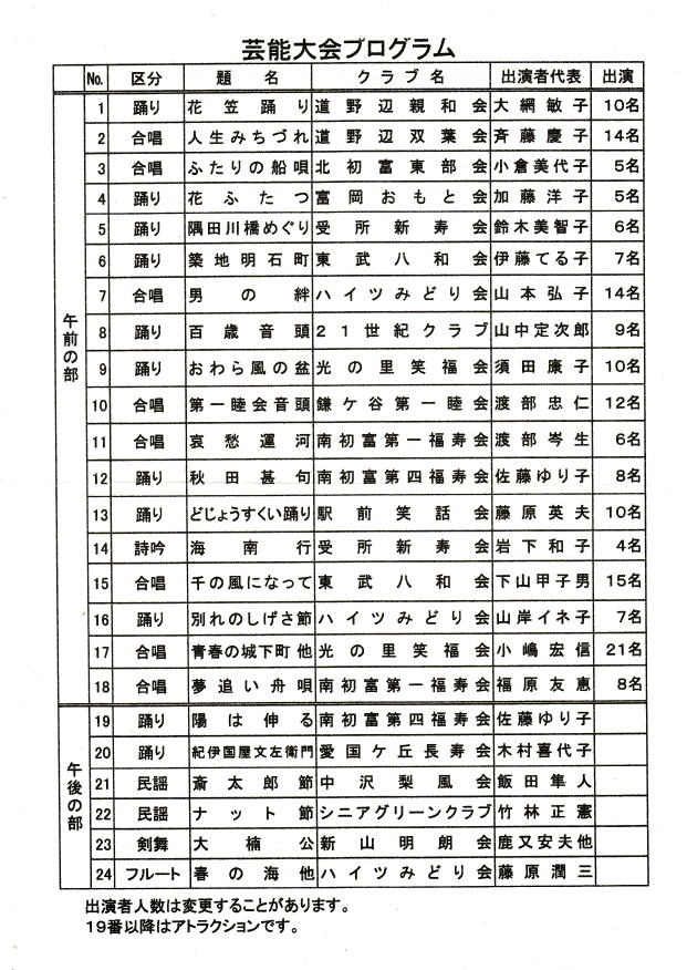 7月13日(水)、市総合福祉保健センター6F大会議室において、 午前10時から当市の「第18回老人クラブ芸能大会」が開催された。 おっちゃんも、来年からは否応なしに後期高齢者に間違いなく分類される。 正直な話、老人と名づけられるサークルに入るのは、どうも好みではない。 しかし年々年を加えれば、自分の都合で逃げていても始まらないことでもある。 そんなことで、昨年の正月から近所のシニア・グリーンクラブに仲間入りした。 おかげで、ストレスもかかるボランティアの傍ら、楽しみもたくさん増えた。 仲間のおばちゃんたちは、男性諸君よりは4、5歳は年上だがとにかく元気がある。 その活力に引っ張られて、酒のないカラオケにも、賭けないマージャンでも楽しめる ことが分かった。外に出ればグランドゴルフも、パークゴルフも、歩こう会もある。 室内に閉じこもって盤面と睨めっこ。よりは健康的と言えないこともない。 それを言っちゃあお終いか。 やはり囲碁とパソコンで、一層知力も鍛えて両刀使いでいくとしよう。 ![]() 上の写真は、一緒に行った仲間のおばちゃんたち。今回は観衆として参加した。 午前中は市内各地の老人クラブから、18組が日頃鍛えた演技を披露。 お昼の弁当をご馳走になって、午後からはセミプロ級の方々による三味線や民謡 ハーモニカなど美しい音色を味わった。演ずる人も、見る人も共に楽しんだ一日でした。 そのときの様子を画像でご紹介いたします。 どうぞゆっくりご鑑賞下さい。 ライター千遥 昨年度優勝チームから優勝旗の返還 ![]() 審査委員長からの挨拶 ![]() 本年82歳なれども、囲碁は実力三段で厳しい攻め。民謡や三味線なども巧みにこなす。