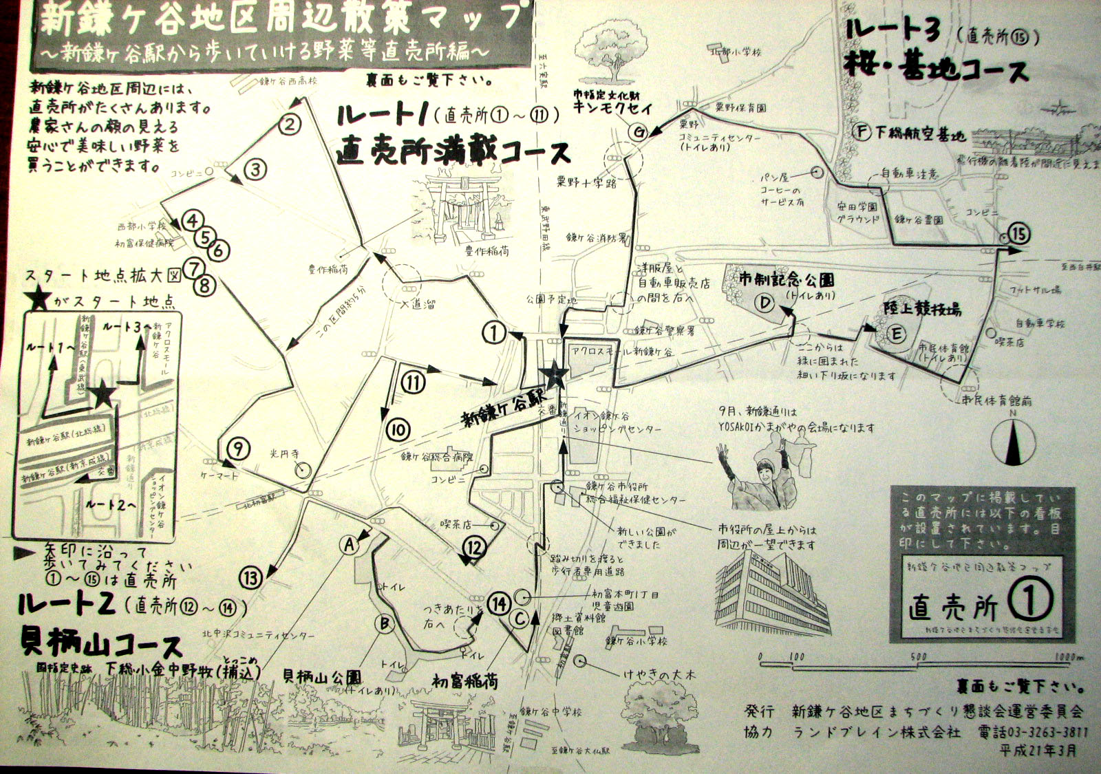 大会本部のコーナーでは、来場された市民に対して当日のパンフレットや「新かまがや地区周辺散策マップ」を無料配布していて、このマップでは新鎌ケ谷駅から歩いていける野菜など直売所を紹介している。3コースが紹介されていて直売所満載コース(新鎌ケ谷駅スタート:一周5.5Km) ②貝柄山コース(一周4.5Km) ③桜・基地コース(一周5Km)等、紹介された直売所の数は15ヶ所。これを機会に自宅周辺を散策がてらに地元産の新鮮野菜の直売所を巡ってみるのも面白いかもしれない。