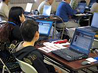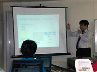 平成21年11月29日(日)NPO法人 かまがや地域情報の窓 主催、鎌ケ谷市教育委員会後援の「ムービー塾」を初富駅近くの中央公民館3階学習室2で開催した。今回のアニメキャラクターを使った動画作成講座は当地では初めての試み。定員20名の受講枠に対し、当日の参加者は17名であった。参加者の内訳は男性11名、女性6名(1組親子で参加)で、参加年齢層は小学生から中高年齢の方まで幅広かった 今回の「ムービー塾」講座の講師は、東北大学准教授の青木輝勝(アオキテルマサ)先生とスタッフの能代さんと学生の三浦さん。このムービー塾に使用する動画作成ソフトは、青木先生が独自開発されたDMD(Digital Movie Director)ソフトをネット上で無償公開し、DMDの楽しさを幅広い層に伝える伝道師として、全国を津々浦々まで飛び回っておられる。今回鎌ケ谷市での開催は第91回目となるそうだ。 *アニメキャラクター動画作成「ムービー塾」のURLは下記を参照下さい。 URL http://www.movie-school.org/ また、受講者や「ムービー塾」登録会員が作成した作品を「DMDチャオ」サイトに投稿し、ネット上で閲覧する事ができる。