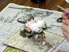 プリザーブド・フラワーとは、生花や草木を特殊保存加工(オーガニック(有機)保存液や食用の着色料を使用しているので人体や環境にやさしくできている。)を行って、植物のやわらかい感触・みずみずしいままの形を保ち、長期(2~3年程)間フラワーアレンジメントを楽しめて、手入れも楽なので、生徒さんにも好評である。 今回の作品テーマは、「アンティークボード・アレンジ」で、プリザーブド・フラワーで飾ったボードを壁掛け用にも使えるし、また飾り台にアンティークボードを立てかけて室内の可愛い飾りとしても利用できる。