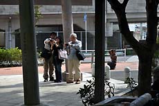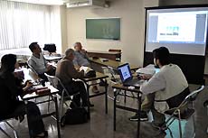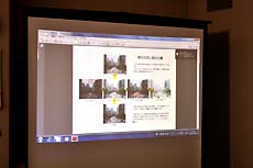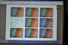 外での撮影が終わって、教室に戻り講師から測光方式によってどう露光が変わるのか、またホワイトバランスを変えることによりどう写真画面に変化が出るのか(太陽光・蛍光灯・フラッシュ・オート)条件を変えたサンプル写真を表示してその違いを説明された。続いて受講者が神社で撮影さした、各個人の写真データーを正面のスクリーンに写しながら、それぞれの写真について講師より撮影のポイントや写真評価などが付け加えられた。
