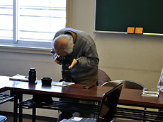 その撮影結果を後ほど、講師の指導により今回の受講者が撮影した写真データーをプロジェクターで拡大した画像を皆で見ながら講師から、各自の写真データーについて撮影のポイントなどを指摘してもらった。筆者の場合はマクロ撮影で被写体にピントを合わせたつもりが、被写体のごく一部(眼とか口など)にしかピントが合っていない事が判明した。講師の説明によればマクロ撮影では被写体のディテイルまでしっかりとピントが合うように撮影する事が必要であり、カメラを抱えたままでは手振れが生じてピントを上手く合わせられないので、三脚などを使うことを薦められた。