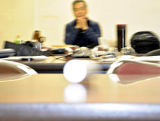 講師より、今日の講座でストロボと絞りの関係を体験するために、室内の蛍光灯を消した状態でのカメラのシャッタースピードと絞りの値を、自分のカメラで確認するように言われた。次にストロボ発光が出来る状態に切り替えてその時の絞りとシャタースピードの値がどのように変わるかの確認を求められた。