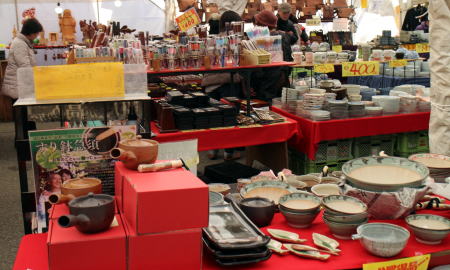 | この催しは、全国大陶器市振興組合(川尻健児代表理事)が地域の活性化や陶芸文化の普及を目的に全国各地で開催しているもので、当会場では10年近く続いており、冬の風物詩にもなっています。昨年は開催初日に大雪にあって大変でしたが、今回は朝日、読売の各紙に全面告知を関東地区に一斉PRしたことやNHKのローカル放送で放映されたこともあって連日、賑わっているようです。 |