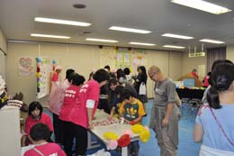 6階では<あそびの広場>で、おもちゃの広場、レクレーション協会によるクラフトづくりや昔遊びも体験もできた。子供の木工工作教室も開かれた。併せて六地区社会福祉協議会の活動紹介パネル展示も行われた。