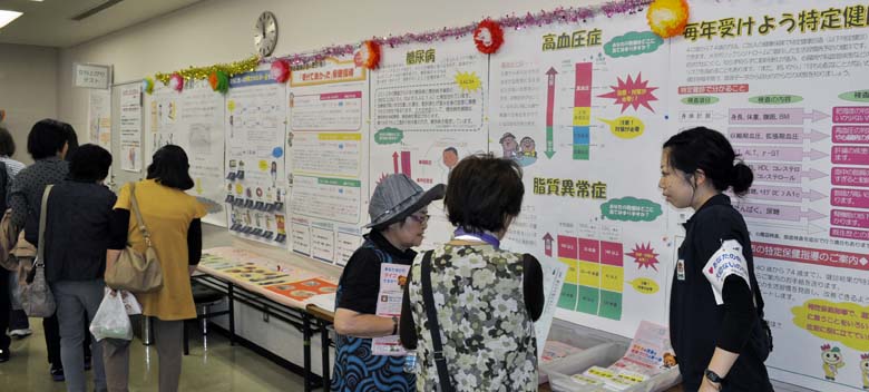 3階では<健康と体験コーナー>で、まちの保健室、赤十字奉仕団の救急法体験、食生活改善協議会の活動紹介、市民にも人気の「あかちゃんハイハイ大会」と「手形とり」に赤ちゃんや幼児を連れた若い夫婦の方たちの参加が多かった。健康づくり推進協議会では成人・予防・歯科の各コーナー別に各種相談受付や展示、身体計測などが行われた。